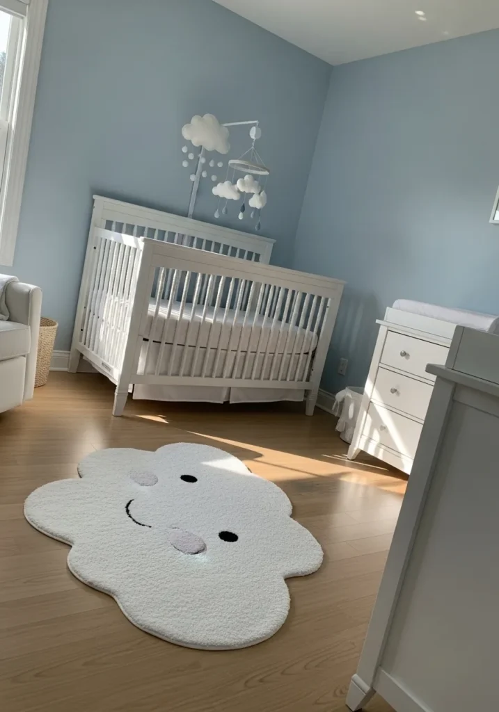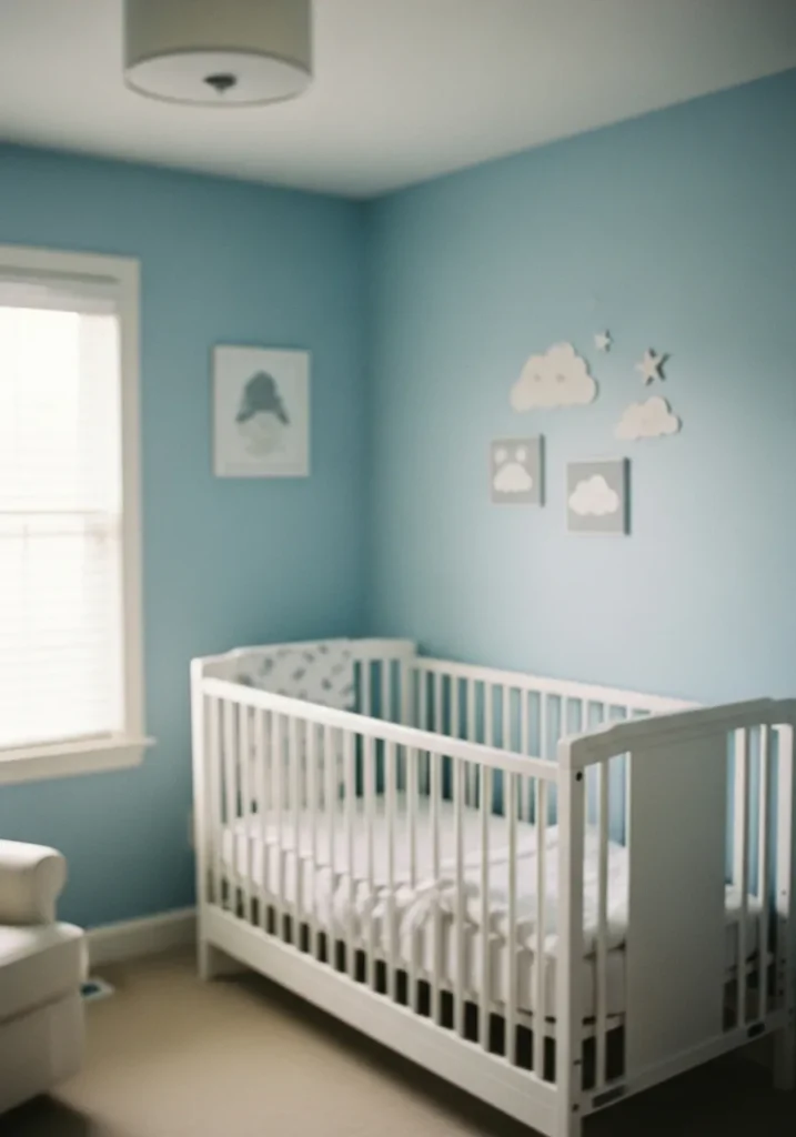 This looks like a soft sky blue, and it feels closest to Benjamin Moore Breath of Fresh Air. It’s a light, clean blue with just a hint of softness, so it doesn’t feel too bright. In a nursery, it reads calm and simple, especially next to a white crib and light trim.