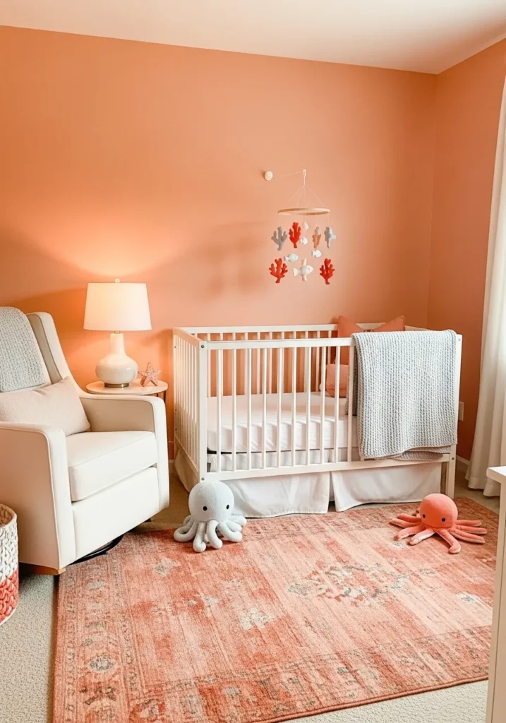 This looks like a warm coral peach, and it feels closest to Benjamin Moore Coral Gables. It sits between orange and pink, with a soft, muted tone that keeps it from feeling too bold. In a nursery, it comes across cheerful but still gentle, especially with a white crib and light fabrics around it.