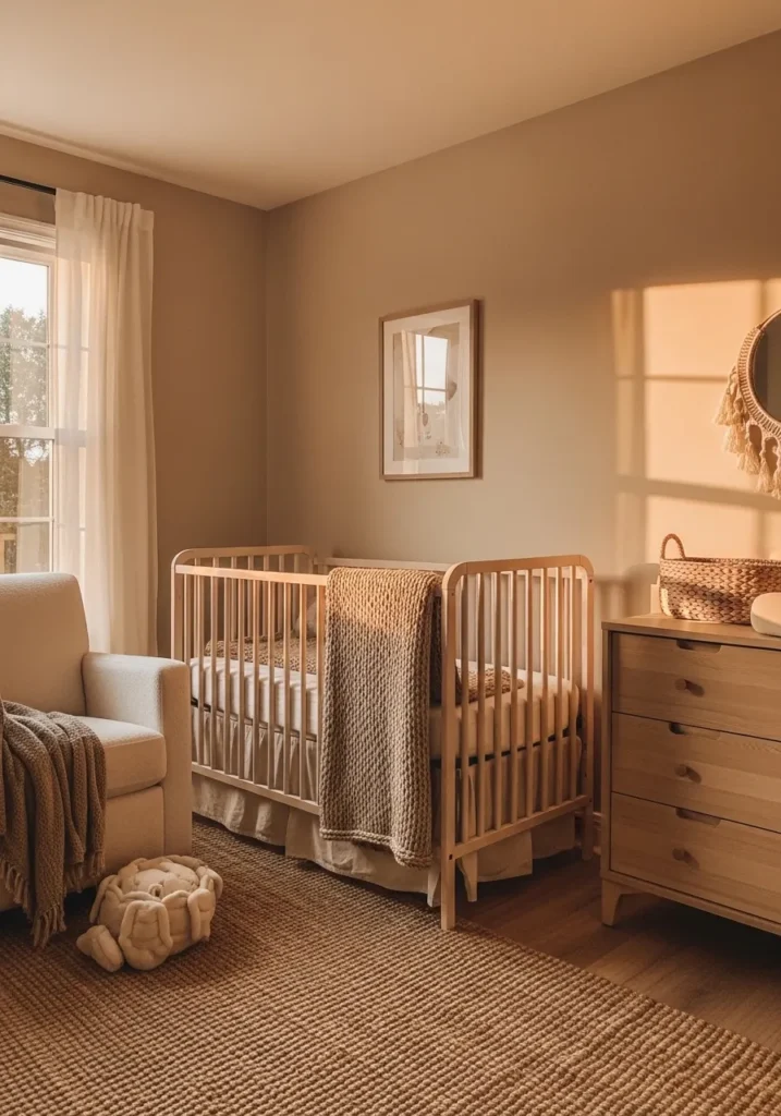 This looks like a warm beige, and it feels closest to Benjamin Moore Manchester Tan. It’s a soft, mid-tone neutral that leans more beige than gray, so it has a bit more presence without feeling heavy. In a nursery, it gives a cozy backdrop, especially next to wood tones like the crib.