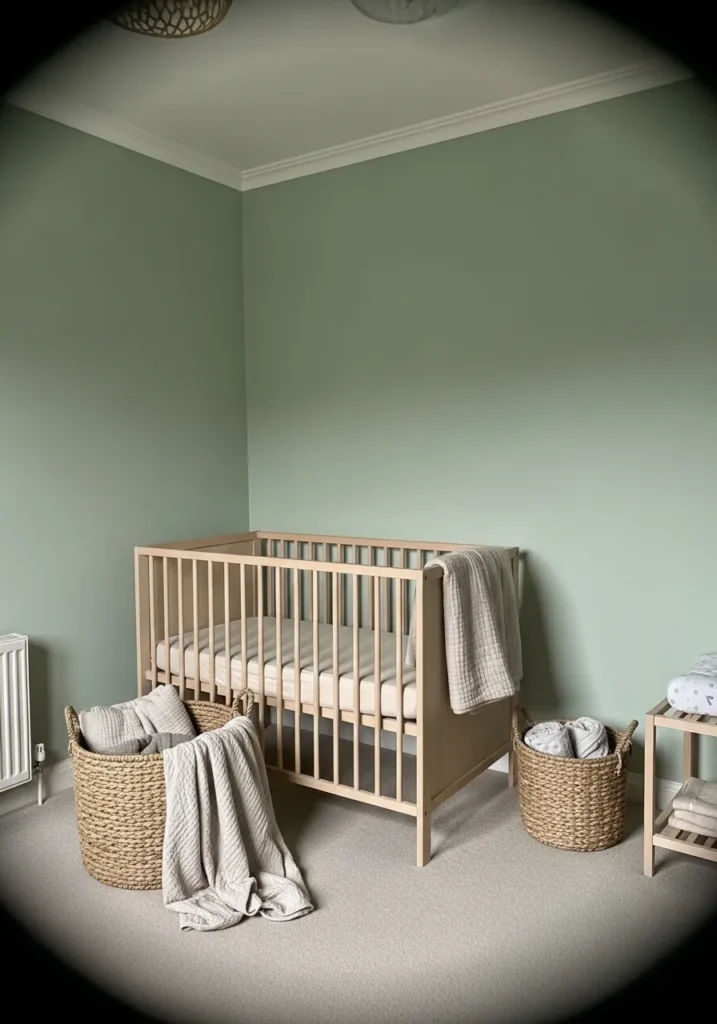 This looks like a soft sage green, and it reads very close to Benjamin Moore Saybrook Sage. It’s a gentle, slightly gray-green that feels calm without going dull. In a nursery, it has a quiet presence that works well with light wood furniture like the crib here.