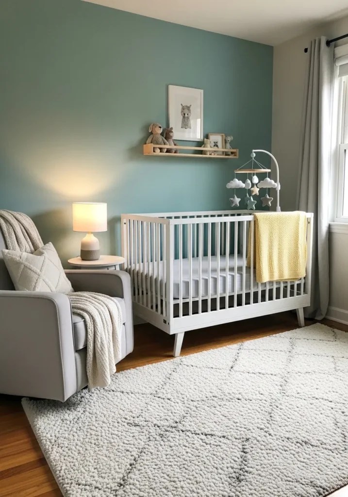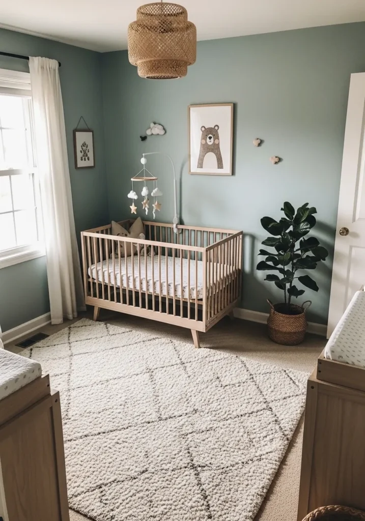 This looks like a soft blue green, and it feels closest to Benjamin Moore Wythe Blue. It sits right between blue and green with a slightly muted tone, so it feels calm without being dull. In a nursery, it has a relaxed feel, especially with a white crib and simple pieces around it .