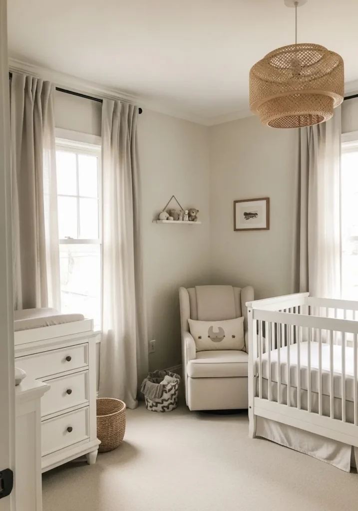 This looks like a soft warm greige, and it feels closest to Benjamin Moore Classic Gray. It sits right between beige and gray, but leans just warm enough to feel comfortable in a nursery. It’s the kind of color that stays quiet and lets simple pieces like a white crib and light curtains stand out.