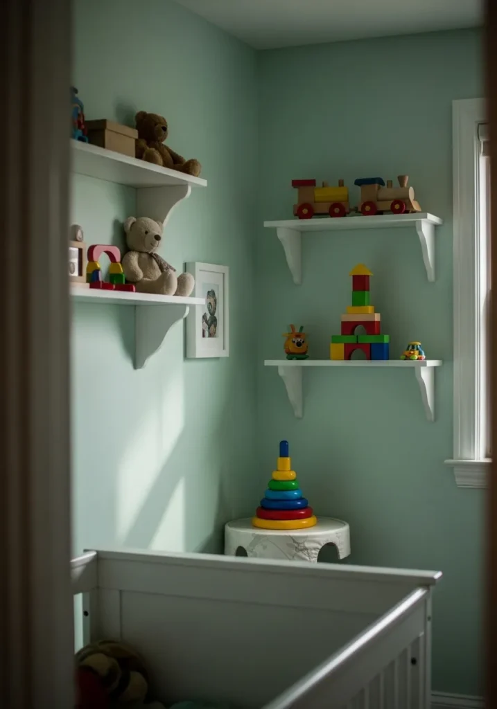 This looks like a soft mint green, and it feels very close to Benjamin Moore Spring Mint. It’s a light, slightly cool green with a hint of blue, so it reads fresh but still gentle. In a nursery, it has a playful side without feeling loud, especially with simple white shelves and light furniture.