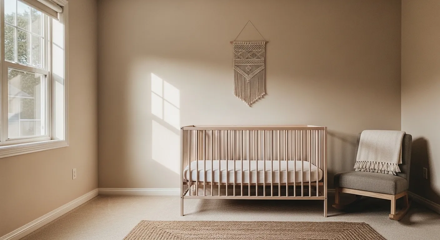 This looks like a warm beige, and it feels closest to Benjamin Moore Manchester Tan. It’s a soft, mid-tone neutral that leans more beige than gray, so it has a bit more presence without feeling heavy. In a nursery, it gives a cozy backdrop, especially next to wood tones like the crib.