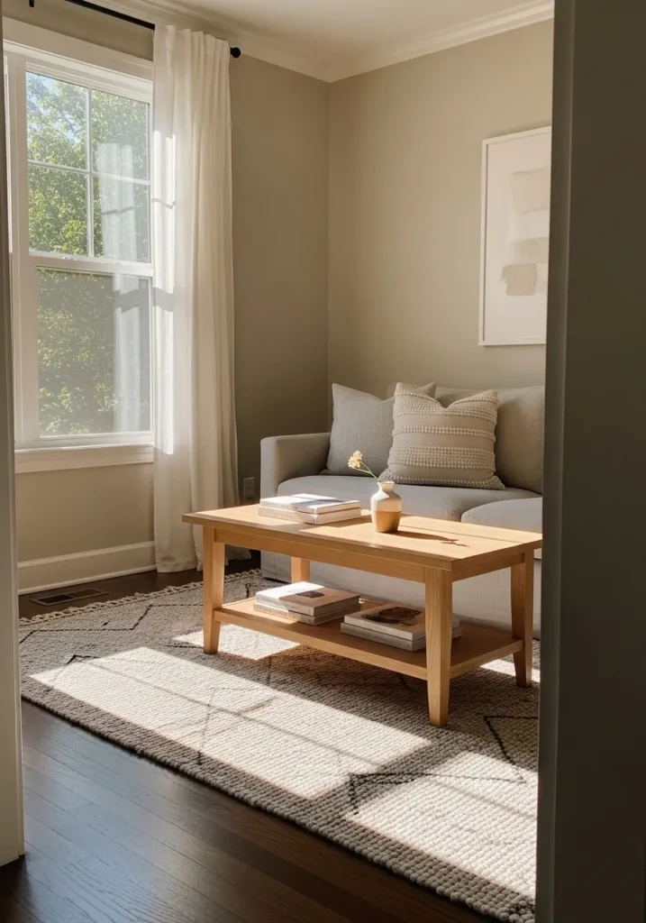 I love how peaceful this room feels the moment you look at it. The warm neutral paint makes everything look cozy without feeling heavy which is such a sweet spot for everyday living. The sunlight on the rug and coffee table gives the whole space that effortless weekend morning vibe. It feels like the kind of room where you would curl up with a book and completely lose track of time.