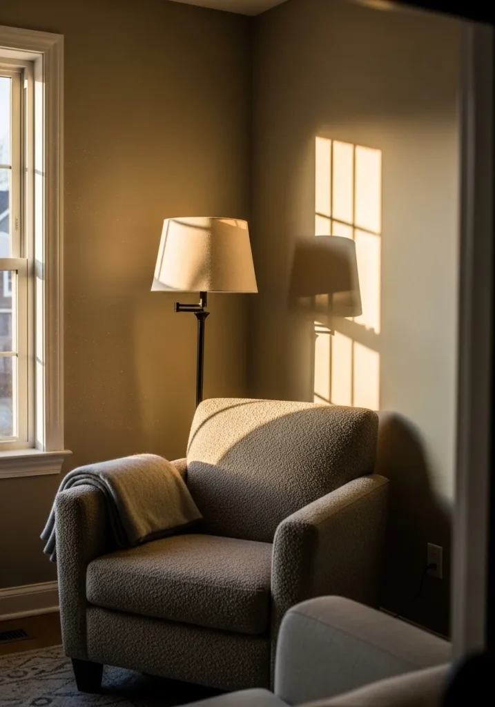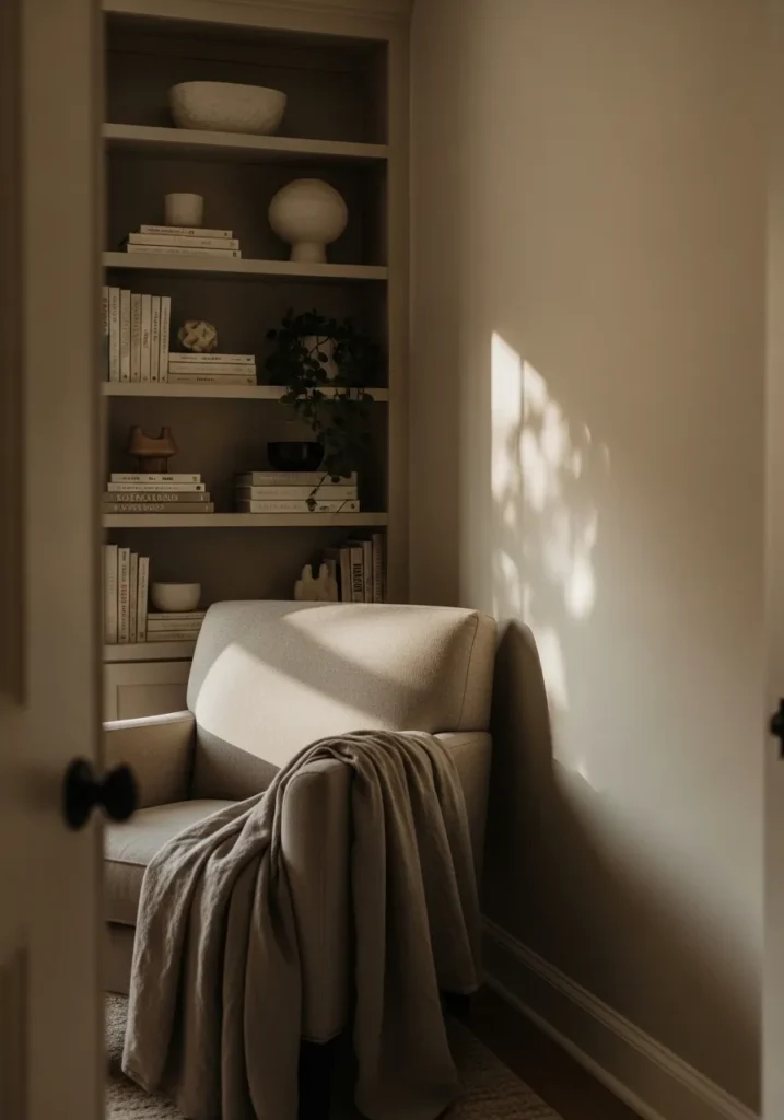 Warm beige walls give this quiet corner a cozy glow that feels especially beautiful in the afternoon sunlight. The neutral paint catches the golden light coming through the window and creates soft shadows across the wall and floor. A comfortable upholstered armchair sits beside a simple floor lamp which makes the space perfect for reading or relaxing. A folded throw blanket adds texture while the natural light becomes part of the design itself.