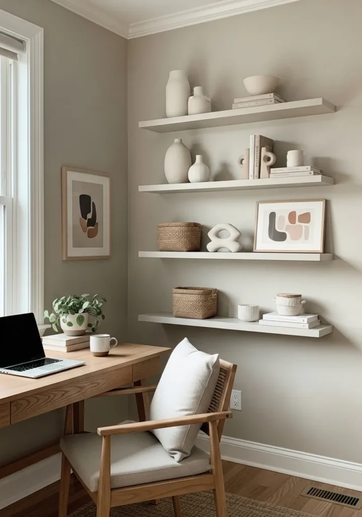 Soft warm gray walls give this small home office a peaceful and organized feel. The neutral paint works beautifully with the floating white shelves that display simple ceramics, woven baskets, and a few art pieces in gentle earthy tones. A light wood desk and chair add warmth while the greenery by the window brings a fresh natural touch to the space. The whole room feels balanced and airy thanks to the soft gray backdrop and the minimal styling.