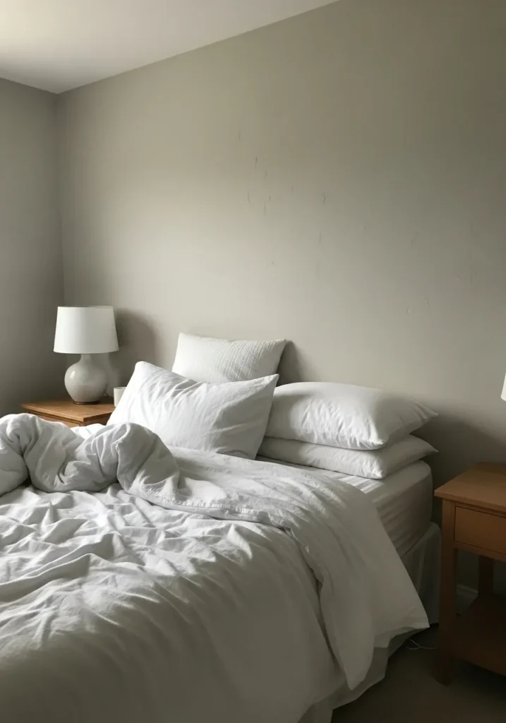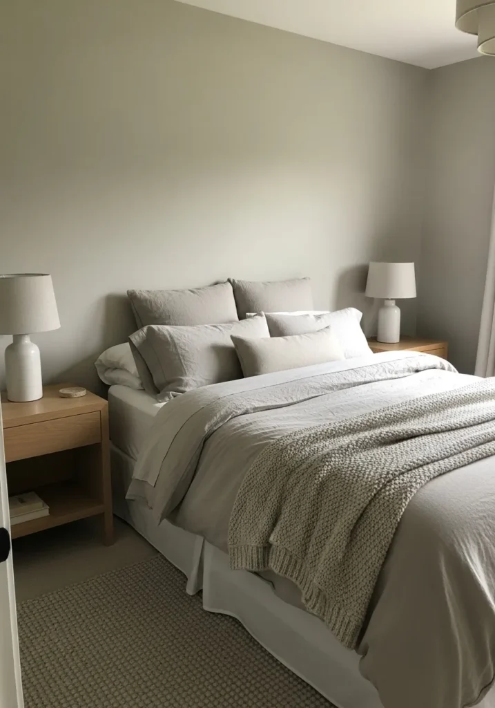Soft gray walls create a peaceful bedroom that feels simple and restful. The neutral tone looks beautiful against the crisp white bedding and pillows which give the bed that relaxed lived in look. Warm wood nightstands on each side add a natural touch while the ceramic lamp keeps the styling clean and understated. The room feels uncluttered and quiet which lets the soft gray paint become the gentle backdrop for the entire space.