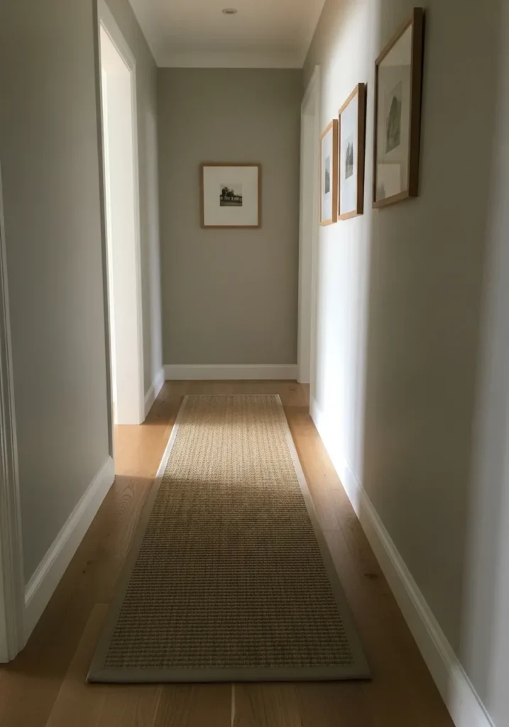 Soft gray walls give this hallway a calm and polished look that feels peaceful from the moment you step into it. The gentle neutral tone pairs beautifully with the warm wood flooring and the simple woven runner that stretches down the length of the space. Light wood picture frames add subtle warmth while the clean white trim keeps everything feeling crisp and balanced. Natural light softly brightens the wall color which makes the hallway feel open rather than narrow.