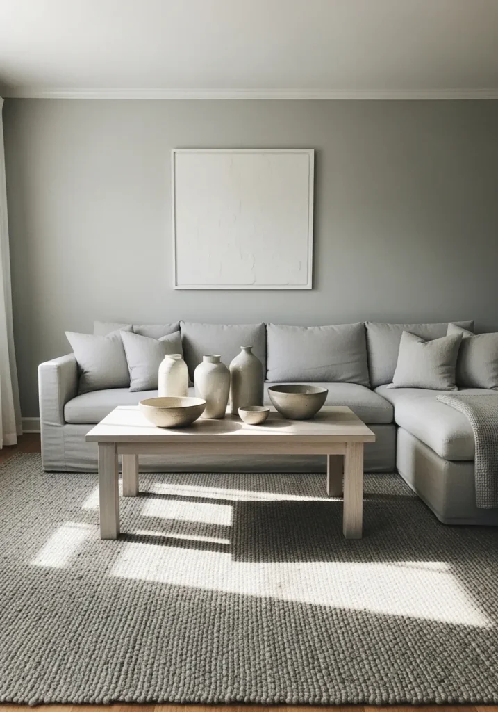 Gentle gray walls create a living room that feels peaceful and effortlessly refined. The neutral paint color provides the perfect backdrop for the plush light sofa and the simple wood coffee table in the center of the room. Soft textures appear throughout the space with a thick woven rug and a collection of ceramic vases that add quiet character. Natural sunlight falls across the floor and furniture which gives the gray walls a soft glow and makes the whole room feel calm and inviting.