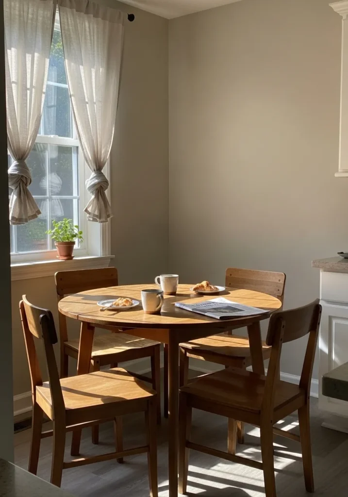 Warm beige walls give this little breakfast corner a soft and welcoming glow. The neutral paint reflects the morning sunlight coming through the window which fills the space with gentle warmth. A round wood table and simple wooden chairs create a relaxed and natural look that feels perfect for everyday meals. Light curtains soften the window while a small plant on the sill adds a fresh and cheerful touch.