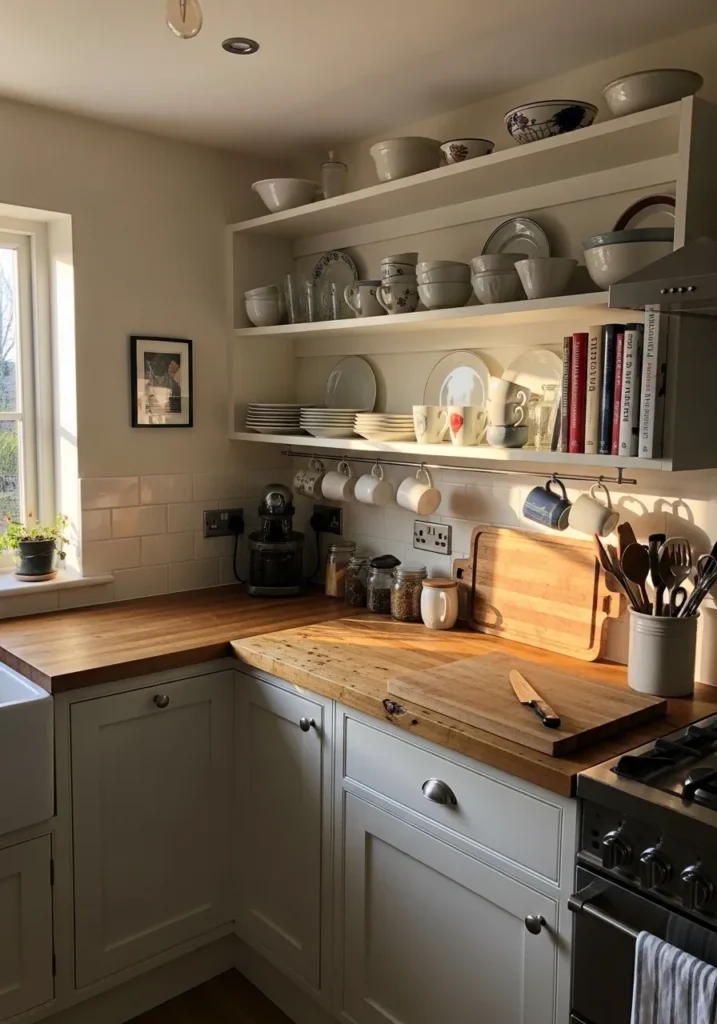 Soft creamy walls give this kitchen a cozy and welcoming character that feels instantly homey. The warm neutral paint blends beautifully with the butcher block countertops and classic shaker cabinets below. Open shelves display simple dishes, bowls, and mugs which adds personality while keeping the space light and airy. Sunlight coming through the window warms the creamy walls and wood surfaces which makes the whole kitchen feel relaxed and lived in.