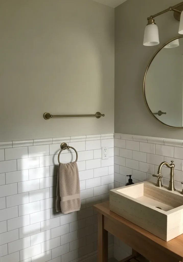 Gentle gray walls give this bathroom a fresh and soothing atmosphere that feels instantly relaxing. The neutral paint pairs beautifully with the white subway tile that wraps the lower half of the wall and keeps the space looking bright and clean. A warm wood vanity supports a stone sink which adds a natural touch against the soft gray backdrop. Brass fixtures and a round mirror bring a subtle hint of elegance that completes the calm spa like feeling.