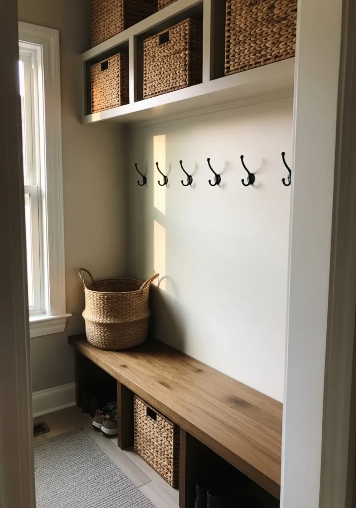 Soft warm gray walls give this mudroom a clean and calming look that makes the whole space feel tidy and welcoming. The neutral paint pairs beautifully with the white built in storage and warm wood bench which creates a balanced mix of light and natural texture. Woven baskets tucked into the cubbies add practical storage while keeping the design cozy and relaxed. Black wall hooks line the panel which makes the space feel functional without losing its simple style.