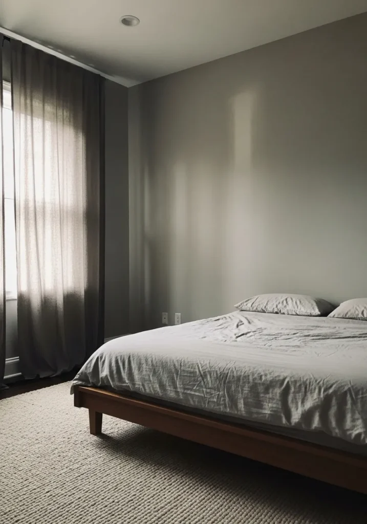 Soft gray walls give this bedroom a quiet and slightly moody atmosphere that feels incredibly peaceful. The deeper neutral tone works beautifully with the simple wood bed frame and the relaxed linen bedding. Long charcoal curtains frame the window and add depth while the light textured rug softens the entire space. The room stays minimal which allows the gray paint color to create a calm and grounding backdrop.