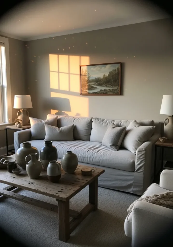 Soft warm gray walls create a living room that feels calm and beautifully balanced. The neutral paint color looks elegant behind the cozy sofa and blends perfectly with the wood coffee table and earthy ceramic decor. Natural light pours through the window and creates a golden glow across the wall which adds warmth to the gray tone. Simple lamps and neutral pillows keep the room feeling relaxed while the rustic table adds texture and character.