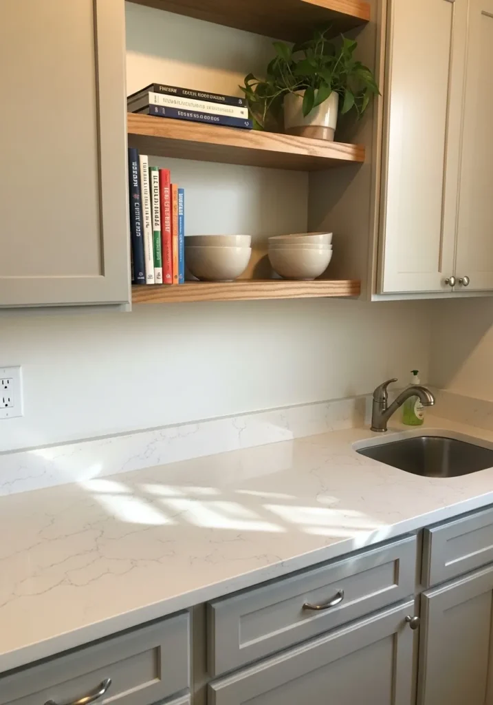 Soft creamy white walls give this kitchen a bright and refreshing atmosphere that feels effortlessly clean. The gentle neutral paint works beautifully with the white cabinets and smooth quartz countertop which keeps the whole space looking light and open. Warm wood shelves break up the white tones and display bowls, books, and greenery that add personality and natural texture. Sunlight glides across the countertop and backsplash which makes the creamy wall color glow softly throughout the room.