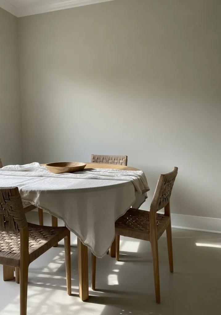Warm beige walls give this dining space a soft and airy feeling that feels wonderfully relaxed. The neutral paint color creates a calm backdrop for the simple wood table and woven dining chairs. A light linen tablecloth drapes gently over the table while a wooden bowl adds a quiet natural accent. Sunlight moves across the floor and chair legs which gives the neutral walls a gentle glow throughout the room.