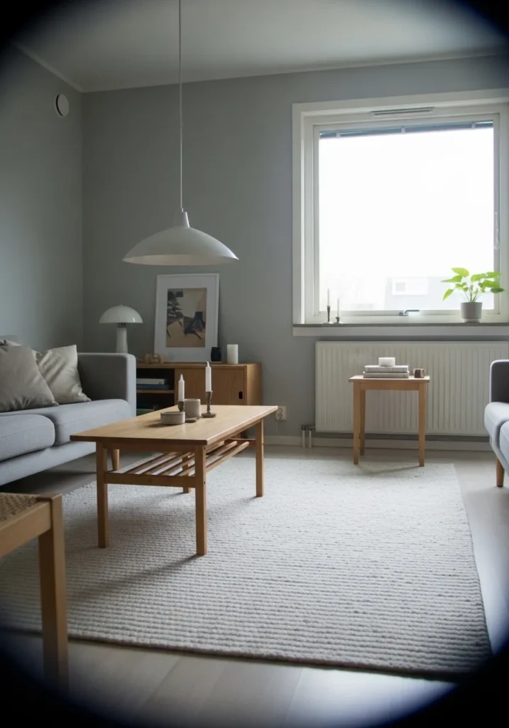 I find this kind of space incredibly soothing to look at. The soft gray walls make everything feel calm without feeling cold or flat. The neutral layers of fabric and light wood create that cozy Scandinavian mood that many of us secretly wish our living rooms had. It feels like the perfect place for slow mornings with coffee and a quiet moment before the day begins.