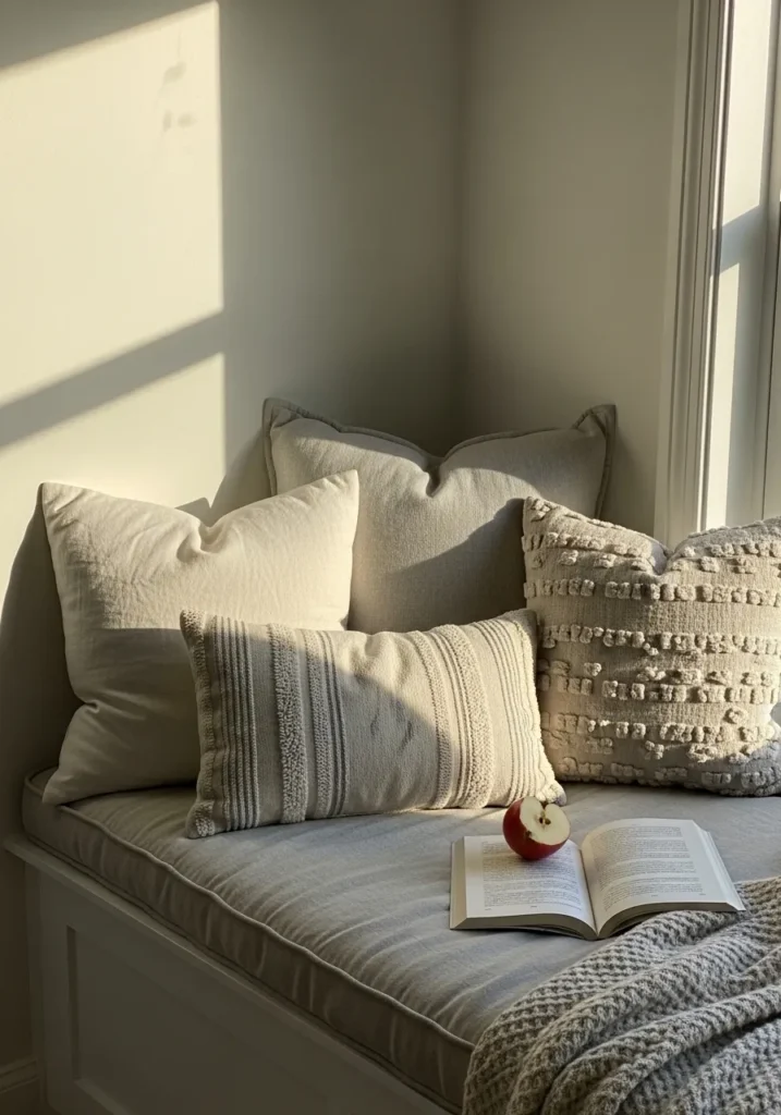 Warm creamy walls create a cozy little corner that feels peaceful and full of gentle light. The neutral paint softly reflects the sunlight coming through the window which makes the space glow with warmth. A cushioned bench layered with textured pillows invites you to sit down and relax. A soft knit throw and an open book resting beside a sliced apple add a simple lived in charm that makes the nook feel calm and welcoming.