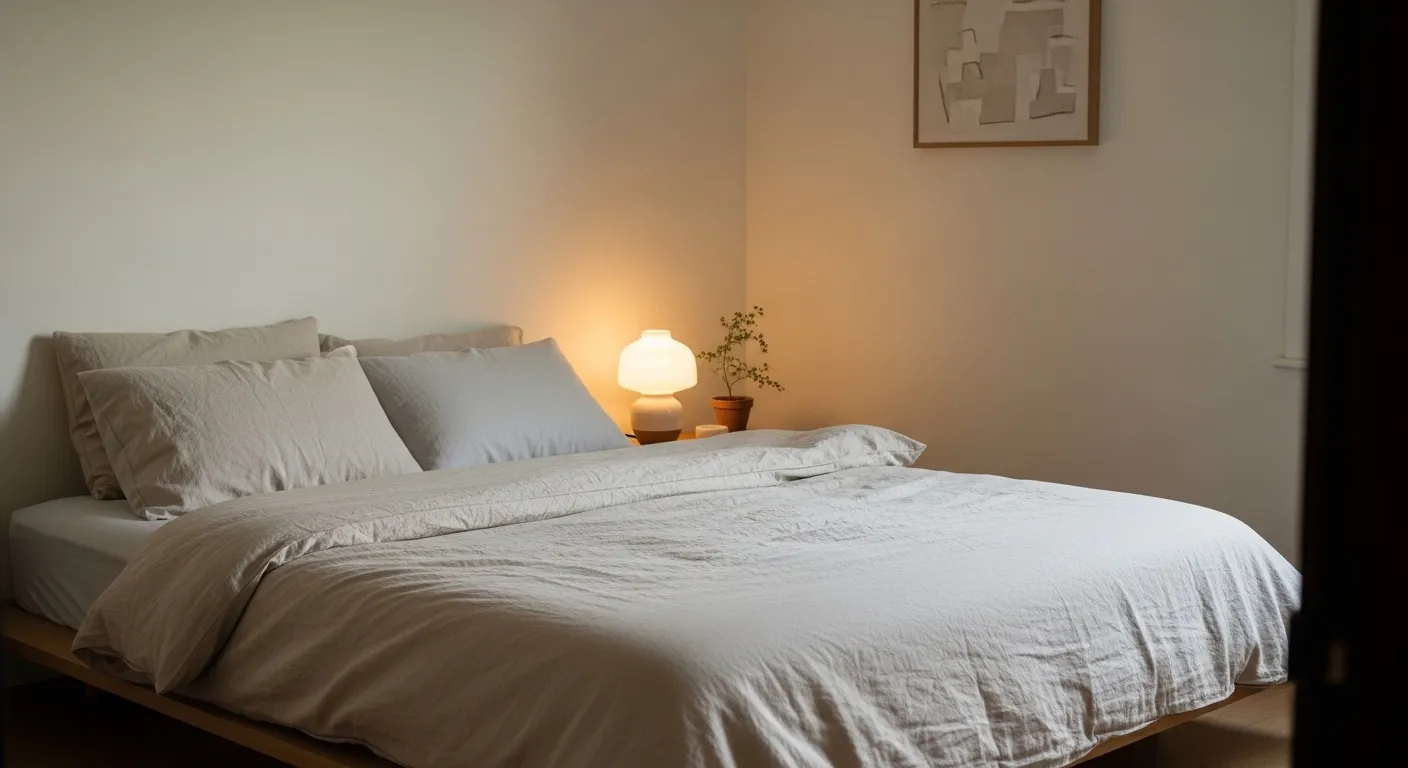 Warm beige walls give this bedroom a calm and soothing atmosphere that instantly feels comfortable. The soft neutral paint pairs beautifully with the layered white and cream bedding which creates a gentle and inviting look. Light wood nightstands on each side of the bed bring natural warmth while simple ceramic lamps keep the styling clean and balanced. The textured knit throw and woven rug add quiet depth without taking away from the peaceful simplicity of the room.
