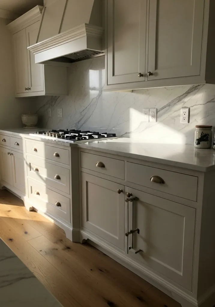 Creamy neutral cabinets create a kitchen that feels bright, calm, and effortlessly refined. The warm off white tone pairs beautifully with the marble backsplash that shows gentle gray veining across the wall. Brass hardware adds a subtle glow while the classic shaker cabinets keep the design timeless. Sunlight moves across the countertop and oak floor which makes the creamy paint feel even softer and more welcoming.