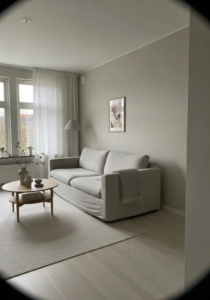 Soft gray walls give this living room a quiet and airy feeling that instantly makes the space feel relaxed. The neutral paint color pairs beautifully with the creamy sofa and light textured rug which keep the palette calm and balanced. Sheer curtains allow daylight to gently filter through the windows while the pale wood coffee table adds a natural touch. Simple decor like the small vase with branches and minimal artwork keeps the room feeling fresh and uncluttered.