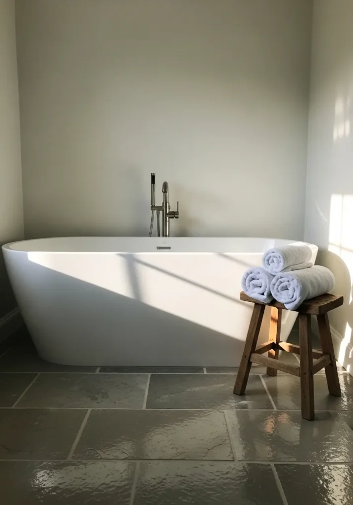 Gentle creamy white walls create a peaceful bathroom that feels airy and quiet. The soft neutral tone reflects the sunlight that falls across the freestanding tub and makes the whole room glow softly. A simple wooden stool with rolled white towels adds warmth against the cool stone floor tiles. Clean lines and minimal decor keep the space feeling uncluttered while the brushed metal faucet adds a subtle modern touch.