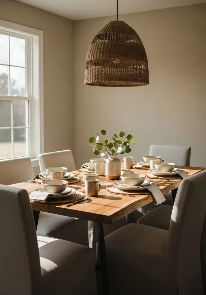 Soft beige walls create a dining space that feels warm and relaxed without looking heavy. The neutral tone pairs beautifully with the natural wood dining table which adds a cozy organic touch to the room. Upholstered chairs in a light neutral fabric keep the palette calm while a woven pendant light above the table adds texture and visual warmth. Sunlight coming through the window highlights the simple table setting and soft wall color which makes the whole space feel bright and welcoming.