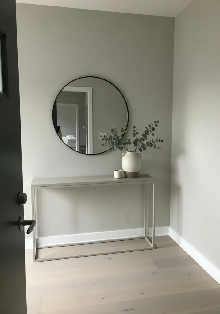 Soft gray walls give this entryway a quiet and polished feeling the moment you walk in. The neutral tone looks clean and airy against the light wood flooring and crisp white trim. A slim console table keeps the space uncluttered while a round black framed mirror adds a modern focal point. Simple styling with a ceramic vase and soft greenery brings a gentle natural touch that warms up the cool gray palette.