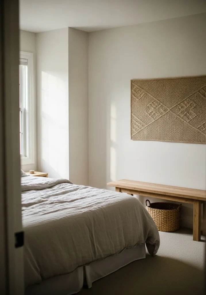 Light neutral walls create a bedroom that feels peaceful and wonderfully uncluttered. The soft gray beige tone reflects the daylight coming through the window which gives the room a gentle glow throughout the day. Linen bedding in warm neutral shades adds texture while the simple wood bench and woven basket bring in natural warmth. A woven wall piece above the bench adds subtle character without taking away from the calm atmosphere.