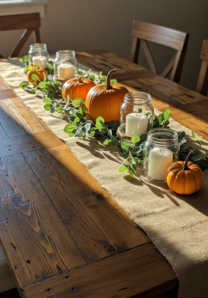 This cozy table design feels like autumn in a snapshot. A simple burlap runner anchors the setup, while small pumpkins and leafy greens add that easy harvest warmth. Glass jars holding white candles keep the look relaxed and homey, perfect for an afternoon Thanksgiving meal filled with laughter.