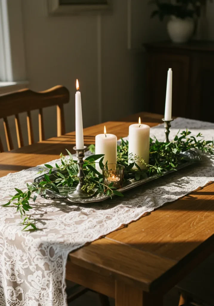 A delicate lace runner sets a romantic tone here, layered with lush greenery and glowing candles. The silver tray and candlesticks add a hint of old-world charm, while the sunlight highlights the textures in the lace.