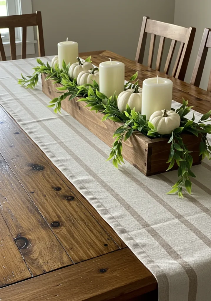 This table pairs a striped neutral runner with a wooden box centerpiece filled with white pumpkins, greenery, and pillar candles. The combination of clean lines and soft colors gives it a calm, balanced feel that’s perfect for modern farmhouse interiors.