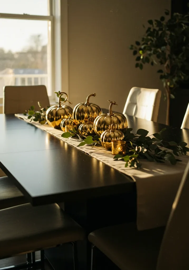 Shiny gold pumpkins line the center of this table, resting on a cream runner surrounded by soft greenery. The sunlight glinting off the metallic finish gives the whole scene a luxurious glow that feels festive and refined.