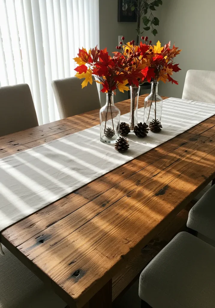 A crisp white runner runs down a rustic wooden table, topped with clear glass vases holding vibrant red and yellow leaves. A few pinecones scattered along the center complete the look, adding texture and a bit of woodland charm.