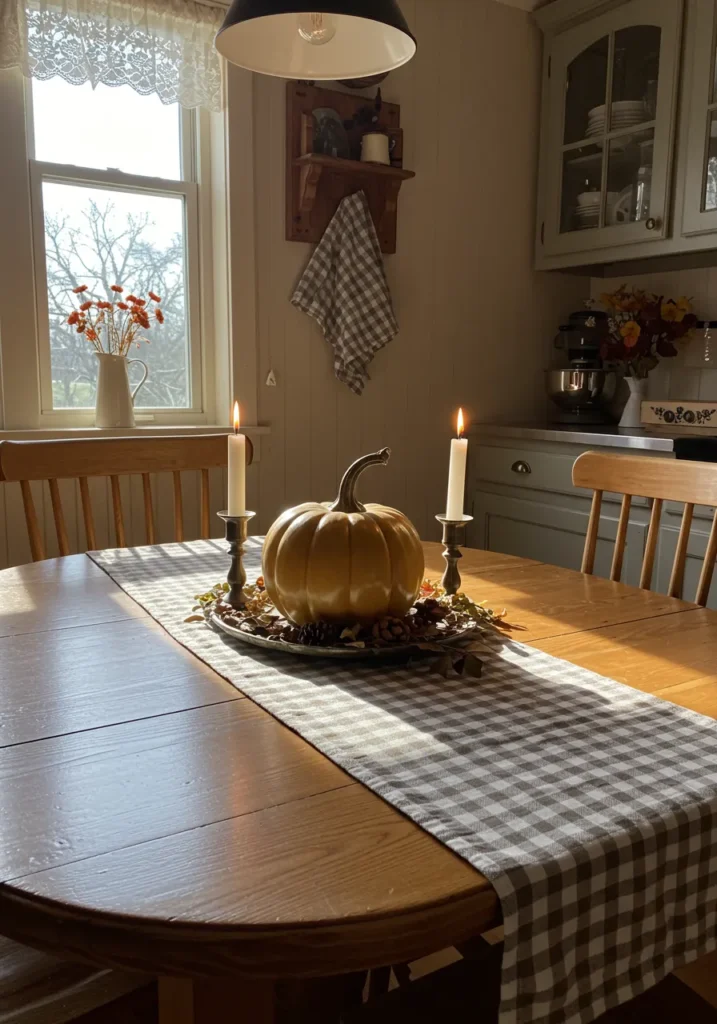 I adore how this look feels like a scene from a cozy farmhouse kitchen on a crisp November morning. The gingham pattern keeps it playful, while the candles add a romantic, old-fashioned charm. It’s one of those setups that make you want to linger a little longer after dessert, just soaking up that calm, golden light.