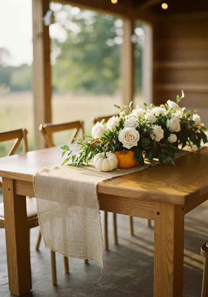 Soft natural light fills this wooden dining space, highlighting a simple burlap runner topped with creamy roses, greenery, and small pumpkins. The mix of white blooms and natural textures feels effortless and serene, creating a look that’s both rustic and refined.