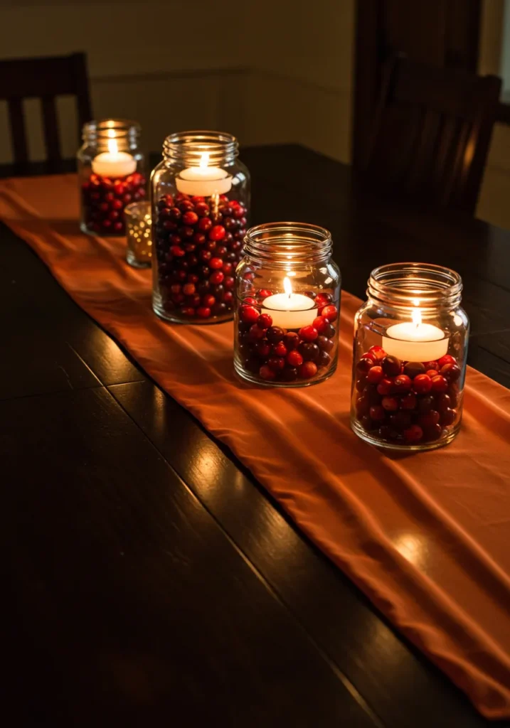 Glass jars filled with cranberries and floating candles line an orange runner, creating a warm and festive centerpiece that glows beautifully against the dark wood table. The combination of deep red berries and candlelight brings instant coziness to the room.