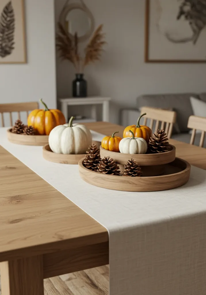 Smooth wooden trays hold an artful mix of white and orange pumpkins with pinecones, placed along a crisp linen runner. The clean lines and neutral palette make this setup feel calm and modern while still giving a nod to classic fall elements.