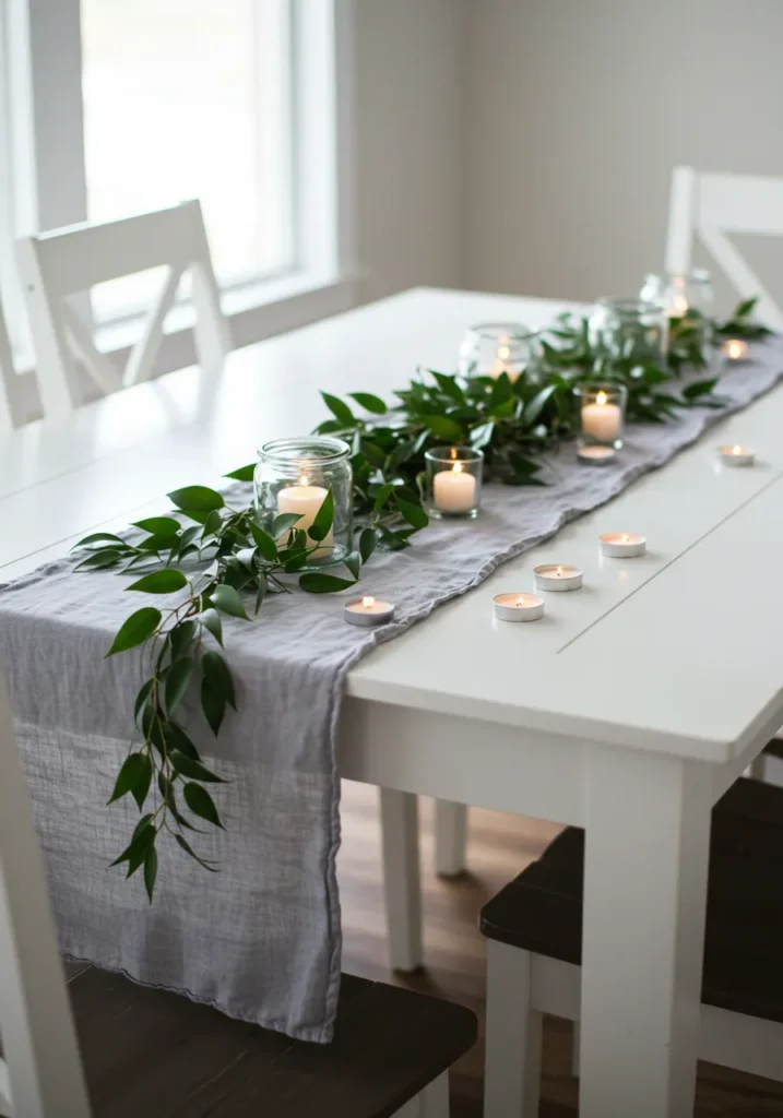 A cool gray linen runner sets the stage for an arrangement of fresh greenery and small glass candles scattered down the center. The clean white table beneath enhances the airy, natural vibe, keeping the whole look light and calming.