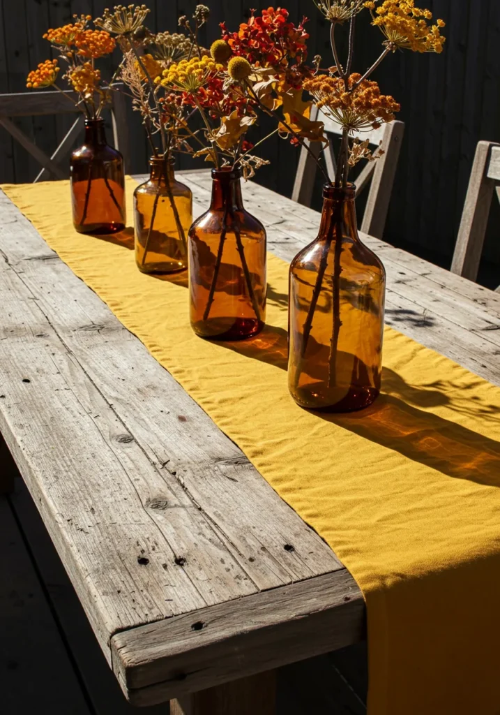 This design feels like a warm afternoon bottled up on a table. The rustic wooden surface sets a relaxed tone, while the bright mustard table runner adds a cheerful pop that feels like golden hour light. Amber glass bottles stand in a neat row, each holding dried flowers in shades of burnt orange and soft yellow. The entire setup glows naturally under sunlight, giving off a cozy outdoor feel that’s casual yet stunning.