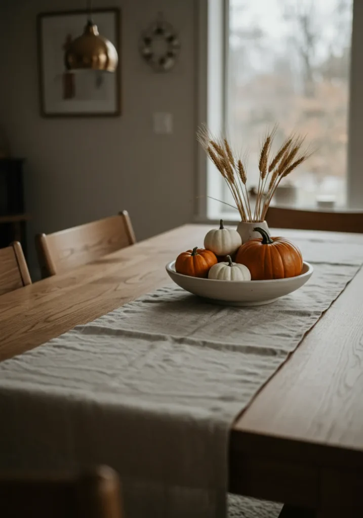 There’s something so calming about this setup. A light linen runner softens the clean lines of the wooden table, creating the perfect stage for a bowl filled with small pumpkins and wheat stalks. The muted tones of beige, white, and soft orange make it effortlessly elegant, and the natural light streaming in gives the whole scene a peaceful, homey feel.
