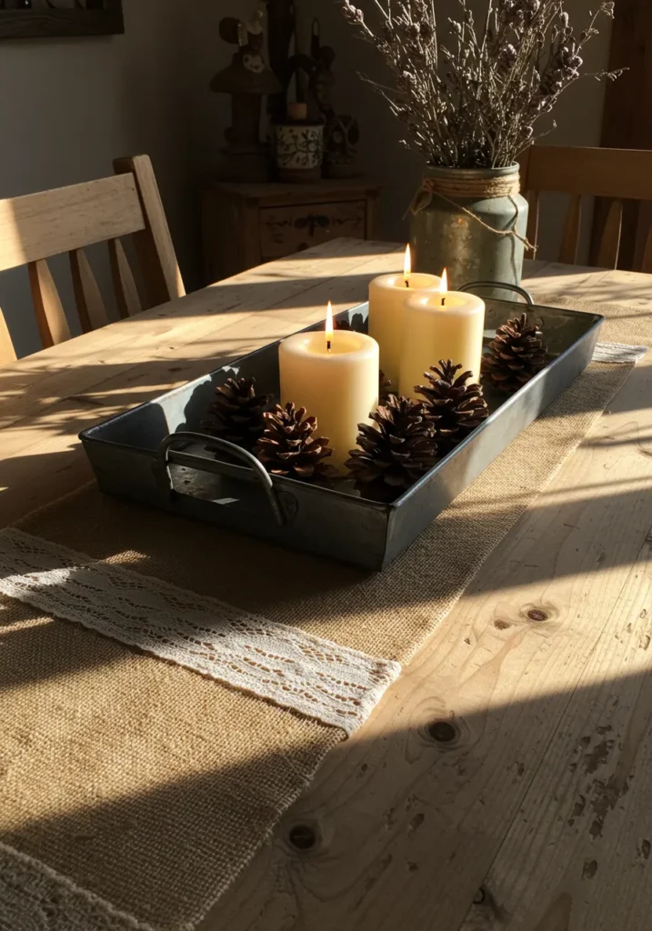 This table feels like autumn comfort captured in one picture. The burlap runner with lace trim instantly adds vintage charm, while the galvanized tray with pinecones and glowing candles creates the coziest centerpiece. The soft flicker of light against the wood grain makes the space feel warm, inviting, and ready for long conversations over dinner.