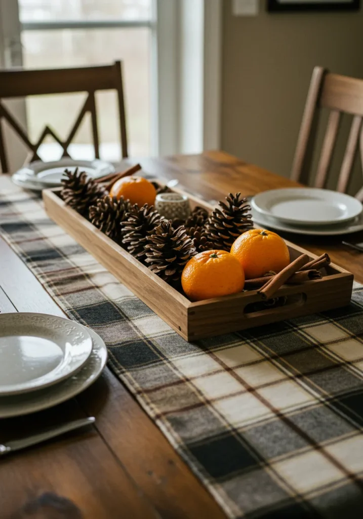 A plaid table runner brings instant coziness, while a wooden tray filled with pinecones, oranges, and cinnamon sticks adds a mix of texture and scent that feels so seasonal. The muted tones of the runner let the natural centerpiece shine without stealing attention.