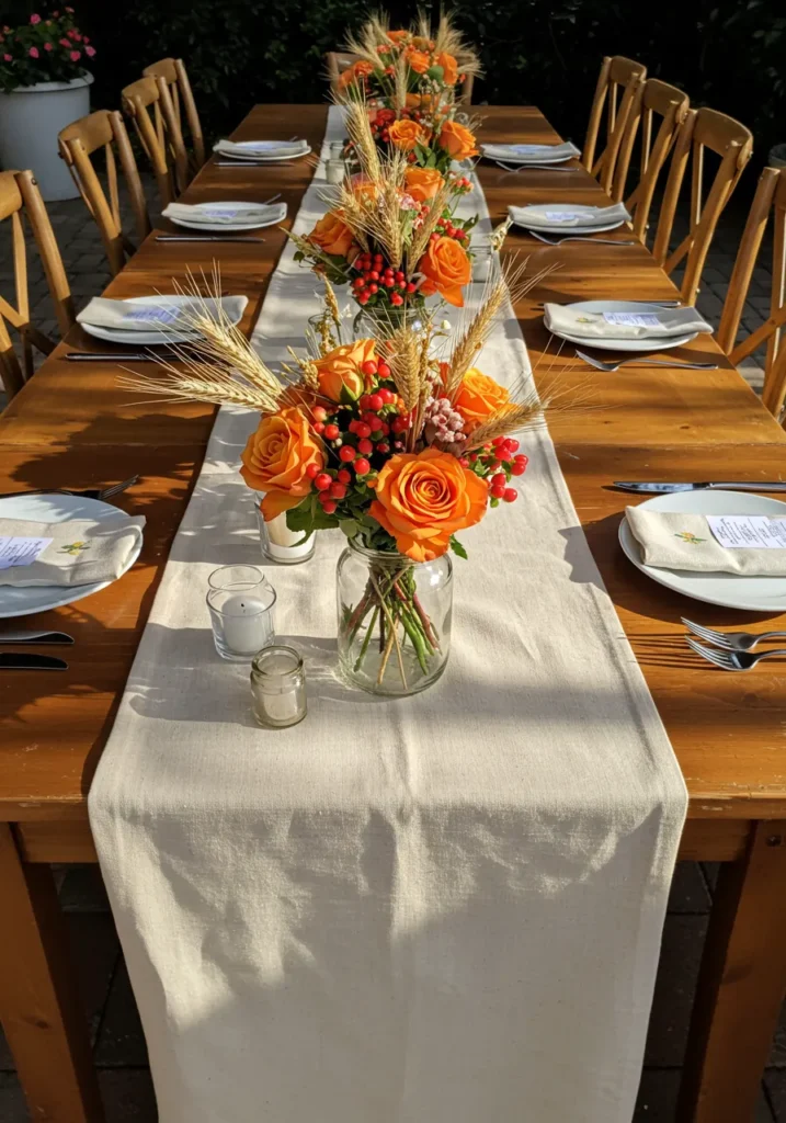 A long linen runner sets the tone for this vibrant table, where golden-orange roses and wheat stems steal the spotlight. The pop of color from the florals against the neutral background brings cheerful energy to the entire space.