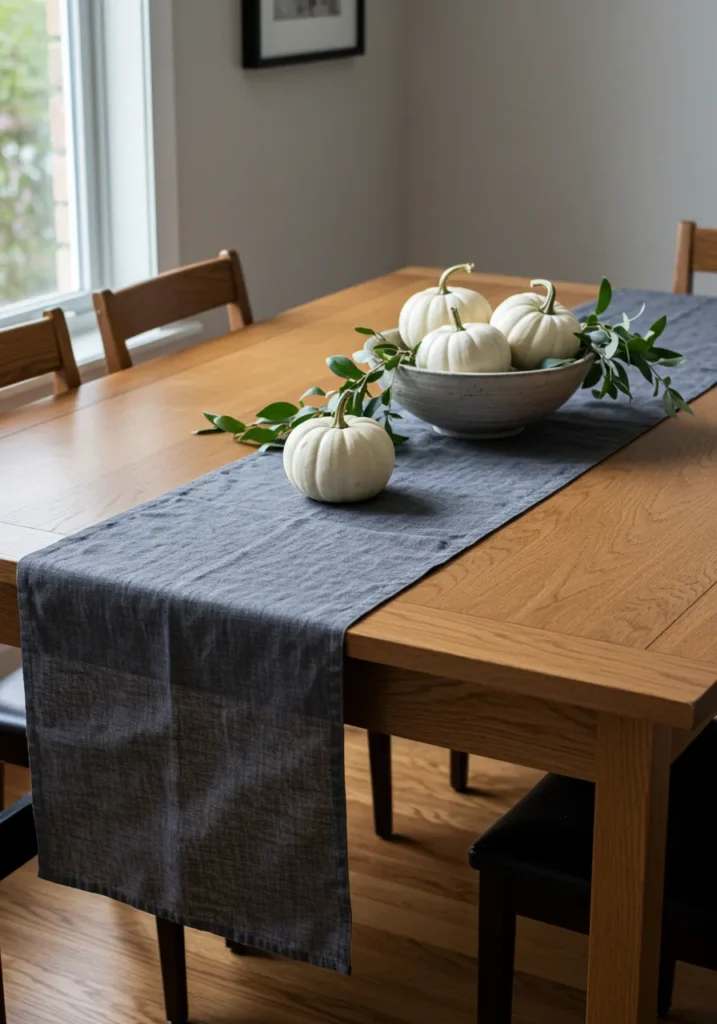 Clean and calm, this table design proves that understated can still feel festive. A cool gray runner paired with creamy white pumpkins and fresh greenery keeps everything sleek and balanced. It’s modern without feeling cold.