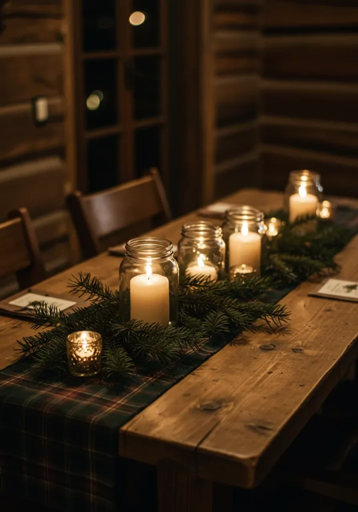 Soft candlelight flickers across a plaid runner and evergreen branches, wrapping the table in a warm, woodsy glow. The mix of natural textures and gentle light makes the whole setup feel like a cozy retreat in the mountains.