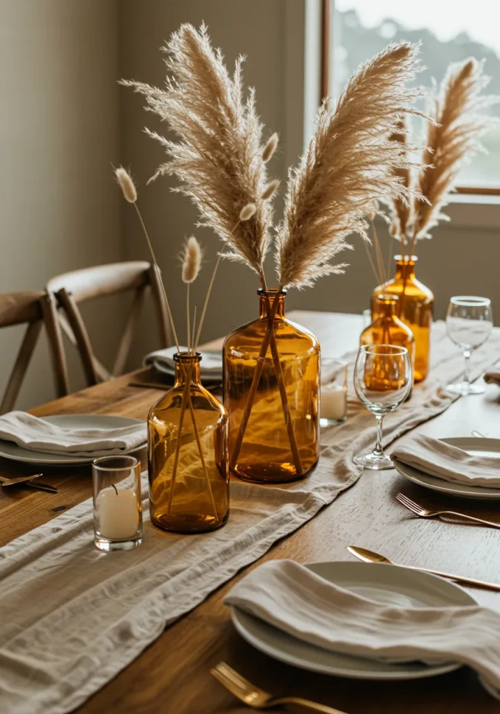 Amber glass vases filled with tall pampas grass sit gracefully along a wrinkled linen runner, giving the table height and soft movement. The warm brown tones of the glass blend beautifully with the wooden table beneath.