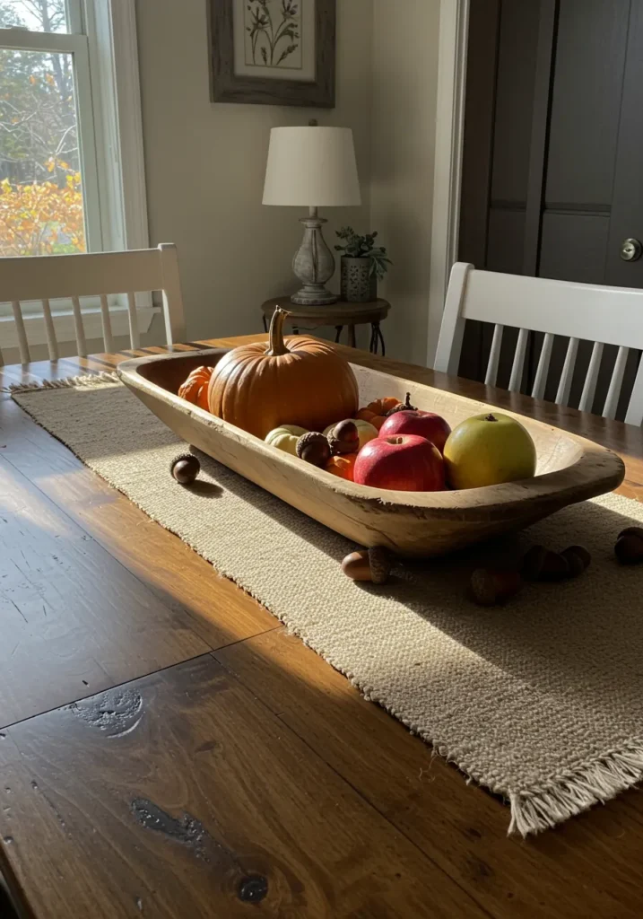 This design feels warm and grounded with its simple burlap runner and long wooden dough bowl filled with pumpkins, apples, and acorns. The mix of rustic textures and soft sunlight creates a homey look that feels both timeless and effortless. It’s the kind of table that feels right at home in a cozy farmhouse kitchen.